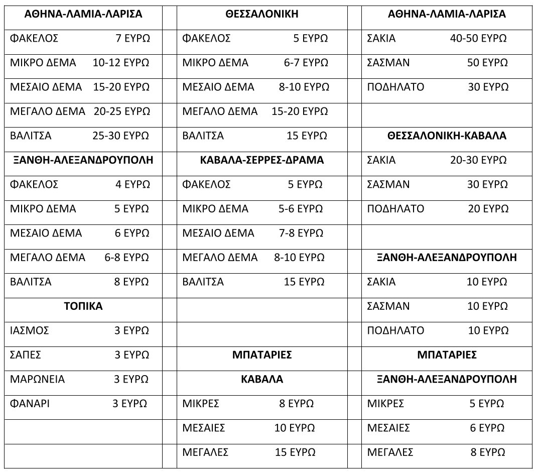 Παρακάτω, πίνακας ενδεικτικών τιμών Αποθήκης Κομοτηνής. ΠΡΟΣΟΧΗ: ΟΙ ΤΙΜΕΣ ΑΝΑΔΙΑΜΟΡΦΩΝΟΝΤΑΙ ΑΝΑΛΟΓΑ ΜΕ ΤΟ ΒΑΡΟΣ ΚΑΙ ΤΟΝ ΟΓΚΟ.